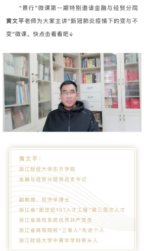 为了帮助师生加强对新冠肺炎的认识,打好疫情防控心理战,金融与经贸分公司党总支书记、经济学博士黄文平带头做起了“主播”。2月9日,公司“景行”微课推出,黄文平开讲第一课“新冠肺炎疫情下的变与不变”。他以防疫为切入点,结合经济专业理论知识,为全院师生分析了疫情对经济社会的影响,号召大家守初心、强信心,众志成城、团结奋战。