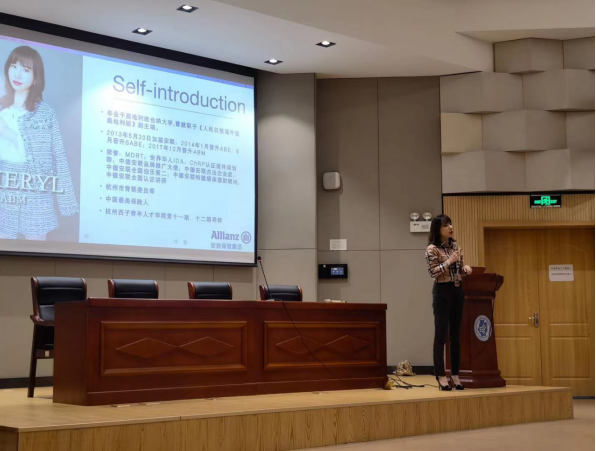 紧接着发言的陈琛华女士,她的一言一行,无不透露着她优秀的人生经历。在演讲中她配套了众多图片,从她的海外生活经历讲到入职安联的初心,一点一滴打动同学们,让大家了解到保险行业在金融业中的地位。同时她的“蓝海策略”也是本次宣讲会的关注点 。