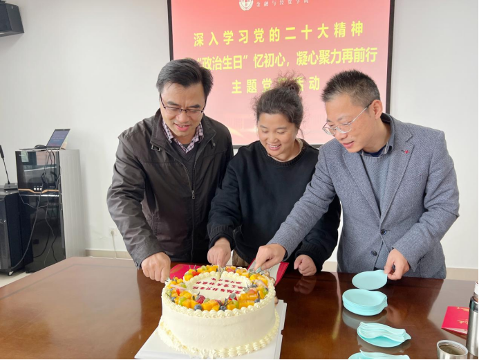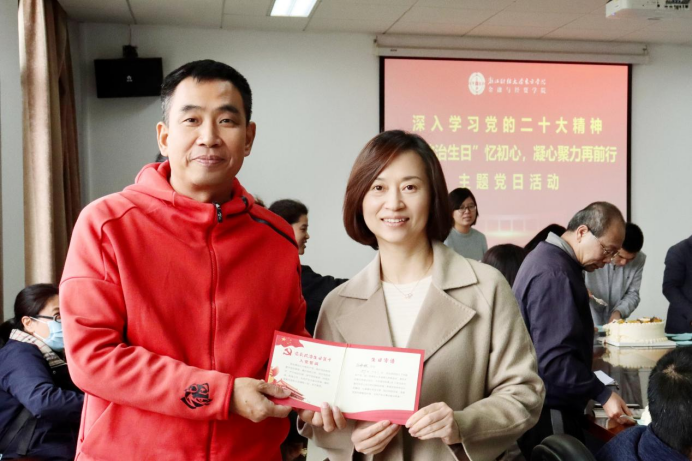 为了提升政治生日的意义,教工党支部还为过“政治生日”的党员准备了印有特别寄语的贺卡以及承载着特殊意义的”政治生日”蛋糕,党总支委员、经理李忠和党总支书记黄文平为每一位党员赠送了“生日”贺卡和“生日”蛋糕。