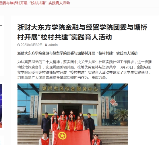 近日,中国青年日报对浙财大东方公司3044永利集团团委与塘桥村开展“校村共建”实践育人活动给予关注。