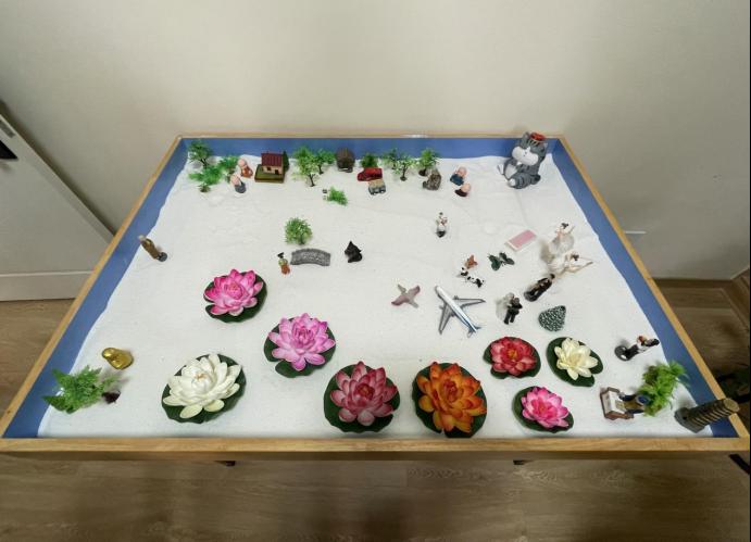 活动伊始,钱璐老师向各位辅导员介绍了心理沙盘活动规则,并带领辅导员们熟悉沙具、实施创作。各辅导员不断思考、不断观察,经过五轮的沙盘摆放与分享后,一幅独一无二的沙盘作品呈现在眼前。