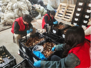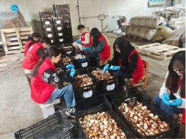 活动现场,工作人员向员工党员详细讲解如何在保证郁金香种球不被破坏的同时将根部进行去皮处理。经过简单的培训、明确分工后员工党员们积极投身工作,借助手套和刀具,默契配合。一下午的时间,八箱郁金香种球全部去皮完毕,为花农后期进行郁金香的种植尽了自己绵薄之力。