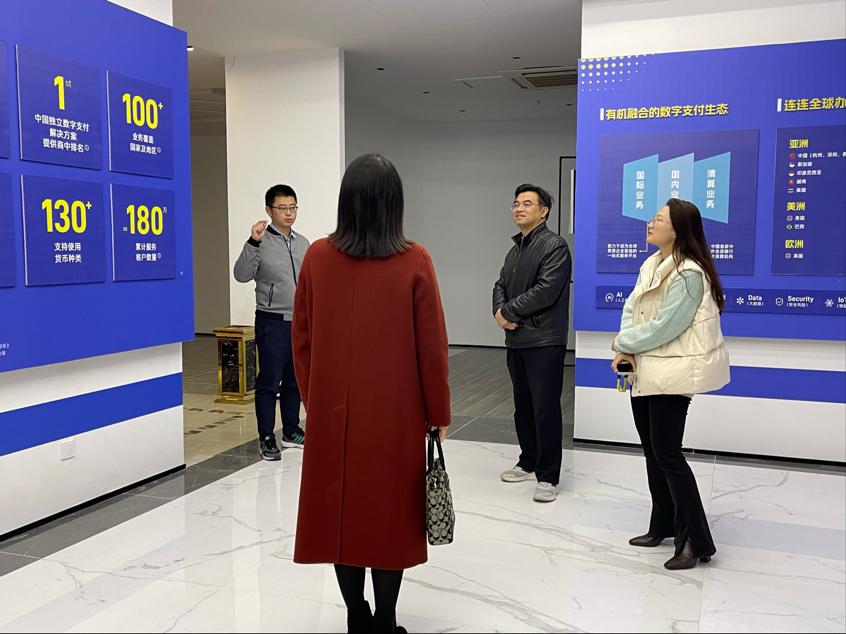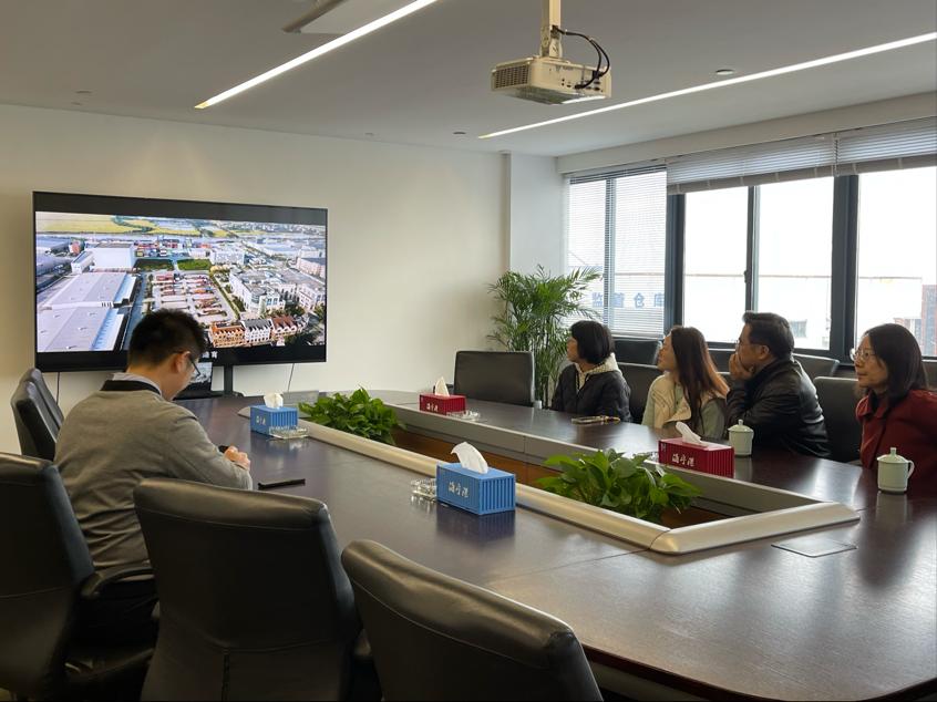 浙江中普连科技有限公司总经理戴晓冬带领教师一行人参观了信天翁产业基地及海宁港,详细介绍了产业园的整体布局和各区域的功能划分。一楼作为企业产品展示中心,已有炼铠堂、连连支付等企业入驻,二楼设置了办公中心、共享中心及按产业带划分的跨境电商直播间等。