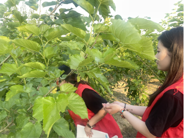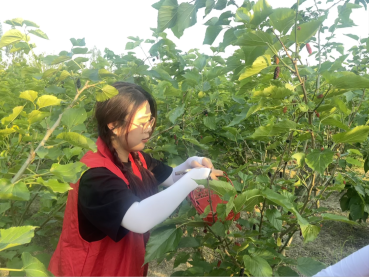 活动伊始,受东升村工作人员的引领,员工党员来到了桑葚采摘园。满树繁盛的桑葚果实,色泽鲜艳,粒大饱满。员工党员志愿者们从工作人员手中领取了村民们提前准备好的小篮子,便开始认真观察并学习村民们采摘桑葚时的技巧。随后,她们迅速融入到了桑葚采摘的队伍中。在村民们细心的指导下,大家两两配合,积极地投入到工作之中。