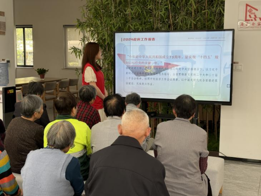 接着,宣讲员工播放了全国两会相关视频,聚焦本次两会热点,从而引入政府工作报告内容,其中包括2023年工作回顾、2024年经济社会发展总体要求和政策取向以及2024年政府工作任务,用通俗易懂的方式为基层群众进行了解读。