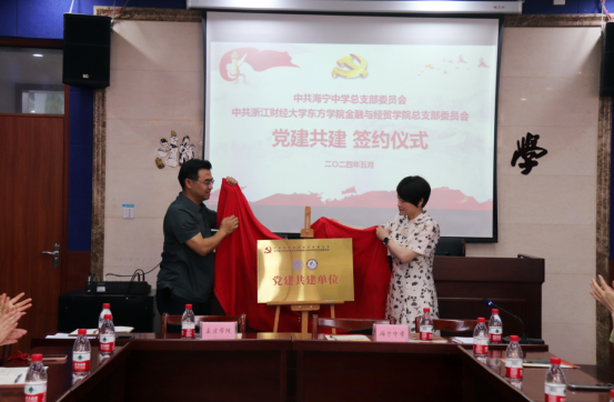 3044永利集团经理李忠和海宁中学党总支书记胡莺共同为党建共建单位揭牌。