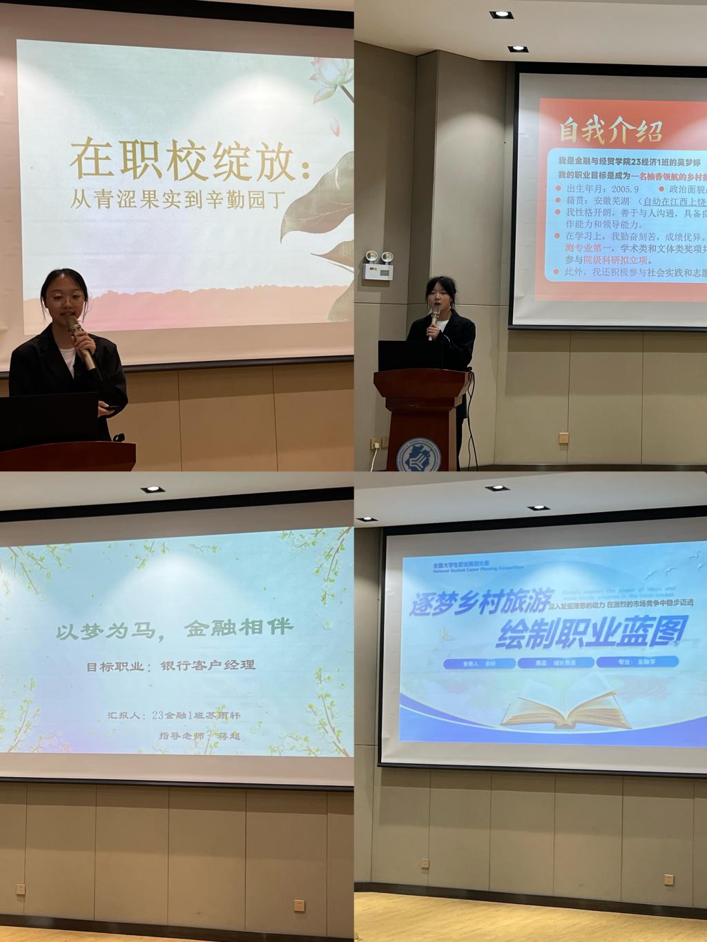 比赛分为两个赛道进行,首先是成长赛道的选手们做了职业生涯规划报告,选手们通过精彩的PPT展示和深入的自我剖析,分别阐述了金融投资分析师、中职教师、老员工村官、老员工农创客等职业的生涯规划路径。从自我认知到职业目标设定,再到实施计划,每一个环节都展现出选手们对未来的深度思考和积极准备。评委们认真聆听,并从多个维度对选手进行评价和指导,助力选手们进一步完善规划。