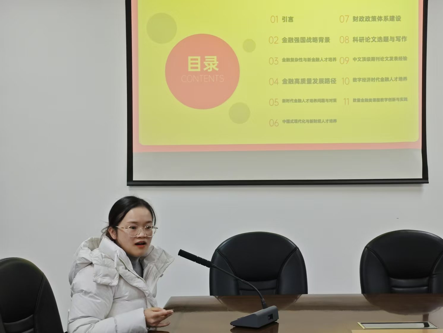 刘冬双老师的分享内容丰富多彩,涵盖了多个重要主题。她首先介绍了“金融强国战略背景”,深入分析了当前国际金融形势及我国金融发展的战略定位,为与会教师提供了宏观的视角和思考。随后,她探讨了“金融复杂性与新金融人才的培养”,强调了随着金融市场的日益复杂化和金融科技的快速发展,培养具有创新思维和实践能力的新金融人才的重要性。