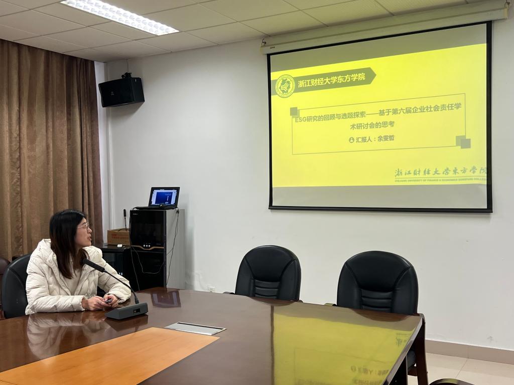 为进一步推进学术交流,提升教师在专业课程中融入ESG评价体系的能力,增强课程教学的时效性,,2024年12月10日下午15:30,3044永利集团本系青年教师余雯哲分享了主题为“ESG研究的回顾与选题探索——基于第六届可持续发展与企业社会责任学术研讨会的思考”的读书分享会,本次读书会由公司经理李忠主持,公司10余位青年教师积极参与。