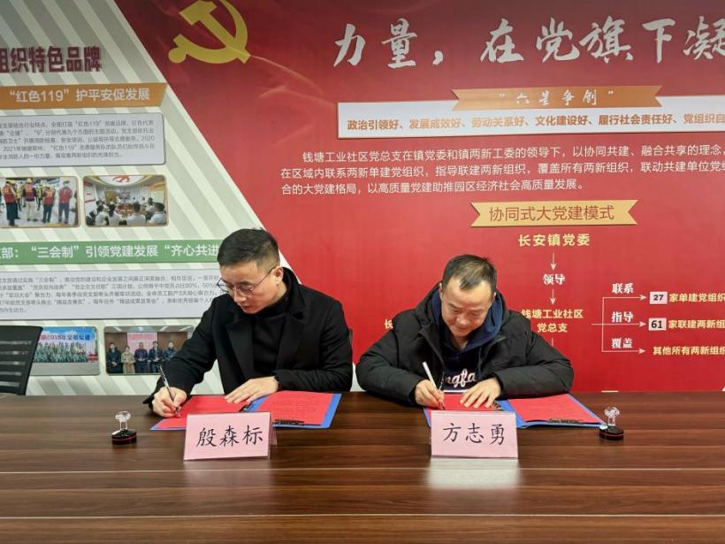 公司党总支书记方志勇和海宁钱塘工业社区党总支书记殷森标共同签署了党建联建协议书。