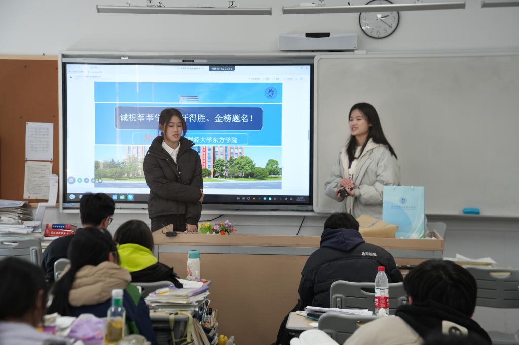 在宣讲会上,作为高三员工的学长学姐,通过生动的讲解、精彩的视频展示以及丰富的图文资料,全方位地向高三同学们介绍了丰富多彩的老员工活。与此同时,传授了一些学习经验、如何缓解考试前紧张的情绪等。通过宣发折页,让同学们对东方的地理位置、录取情况有了了解。