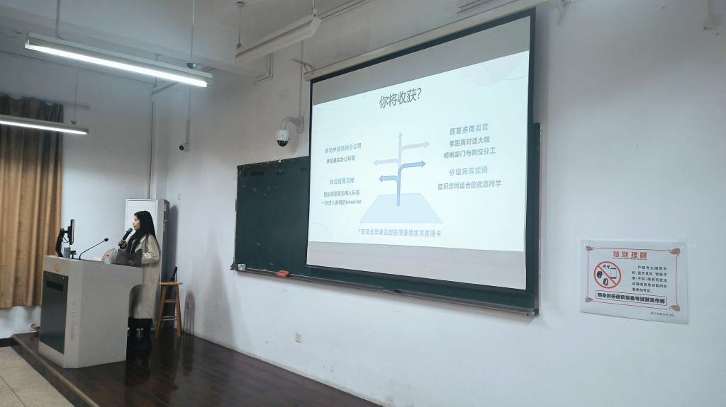 最后,CFA教育中心讲师讲解了本次“名企开放日”的参与流程,鼓励同学们通过本次开放日走出寝室,走出校园,去现场感受证券企业的工作环境,文化氛围,体验招聘流程,完成理论+实操双学习。