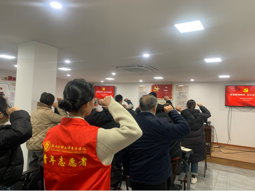 员工党员志愿者和仰山社区的老党员们一起在党旗面前宣誓,象征着对党的忠诚和对共产主义事业的坚定信念。