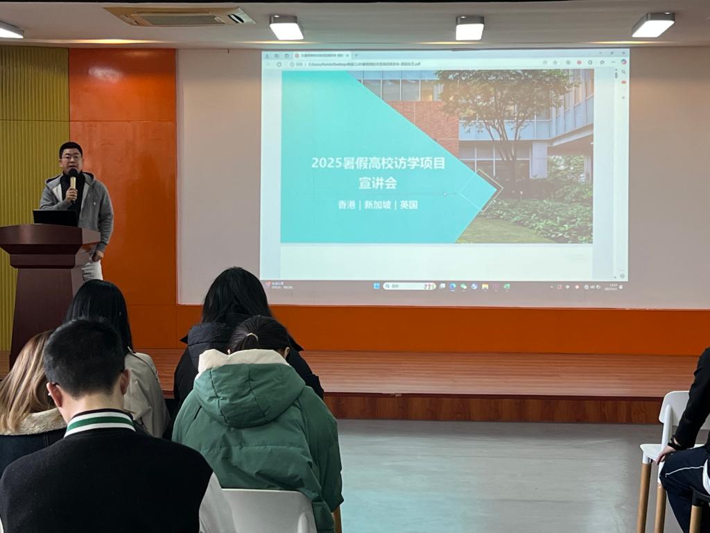 随后,睿拓国际交流访学负责人童黎渊开展了2025年暑期访学项目宣讲。童总首先详细介绍了香港大学、香港中文大学、香港科技大学、新加坡国立大学、南洋理工大学、曼彻斯特大学等相关高校提供的官方学术课程项目和非学术(中文授课)项目,从项目课程设置、日程安排、项目亮点及成果收获等方面进行了细致介绍,并就国际交流访学方面的常见问题与同学们进行了深入交流。