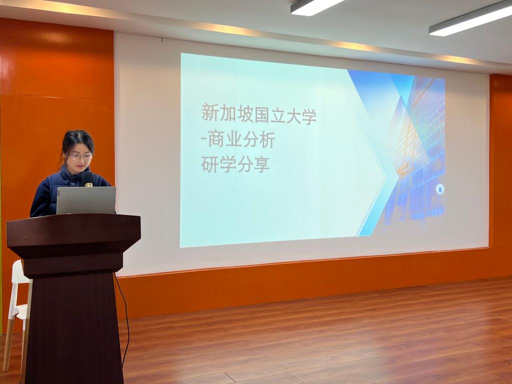 分享会伊始,2023级跨境电商专业张涵妮同学分享了2024年暑期新加坡国立大学研学经历,张涵妮同学从研学课程设置、上课过程、公司环境、机构参访等方面进行了生动汇报。