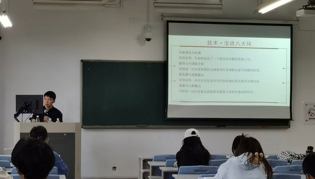 杨阳学长纠正了在认知层面常见误区,强调求职是双向选择,不应单纯追求安稳,海投简历的做法也缺乏针对性。接着在技术板块,他详细介绍了宝洁八大问及STAR表达法则,通过剖析八大问的具体问题,如目标设定与达成、领导力与团队合作等,指导大家如何精准展示个人能力;STAR法则则从情境、任务、行动和结果四个维度,帮助同学们有条理地呈现经历,生动展示了如何运用STAR法则将普通经历转换为亮眼成果。