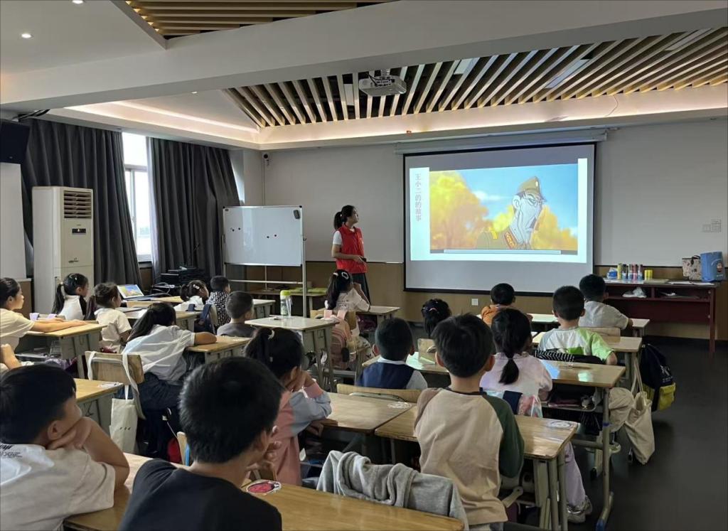 活动开始,志愿者团队为小朋友们带来了一场特别的“红色故事会”。志愿者们通过生动的图画和亲切的讲述,为小朋友们演绎了小兵张嘎的机智故事,并播放了精心剪辑的王二小英雄事迹短片。