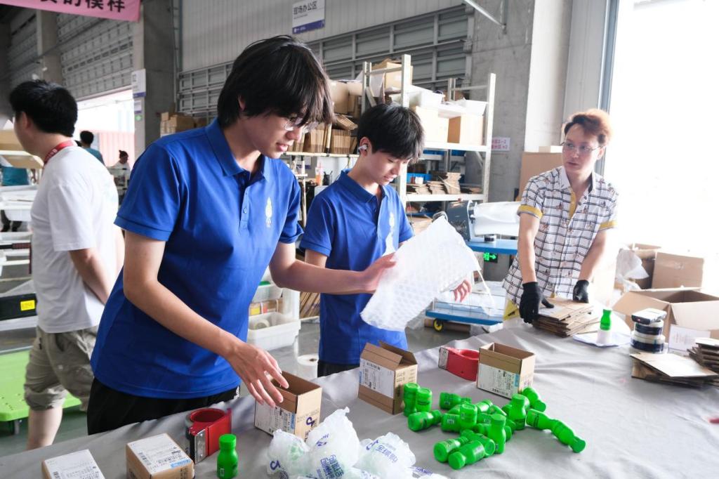 而商品包装实操环节,则让大家有了更深刻的实践体验。在仓库工人的指导下,同学们亲手进行包装,体验商品封装等操作,切身感受到看似简单的包装工作,实则需要兼顾商品保护、成本控制和物流适配等多重因素,真正体会到"细节决定效率"的行业准则。