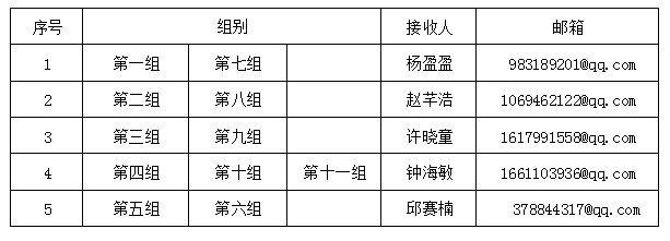 1.5月18日18:00前,所有参加第一次答辩的员工将自己的定稿论文按指定格式(答辩组+答辩组内序号+姓名+班级+学号+论文题目,例:第二组+10+张三+16金融1班+16001200+关于XXX的研究)发送至指定邮箱(如图分配所示),逾期未交的视为放弃第一次答辩;若发送多次的以第一次发送为准;导师认定不能参加第一次毕业论文答辩的员工直接参加第二次毕业论文答辩。