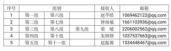 1.4月21日18:00前,所有参加第一次答辩的员工将自己的定稿论文(论文封面需隐去导师姓名)按指定格式(答辩组+答辩组内序号+姓名+班级+学号+论文题目,例:第二组+10+张三+17金融1班+16001200+关于XXX的研究)发送至指定邮箱(如图分配所示),逾期未交的视为放弃第一次答辩;若发送多次的以第一次发送为准;导师认定不能参加第一次毕业论文答辩的员工直接参加第二次毕业论文答辩。