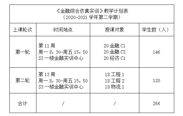 根据2020-2021学年第二学期教学计划安排,2020级金融C1、C2、经济学C1、2018级工程等4个专业将进行《金融综合仿真实训》,教学计划具体安排如下: