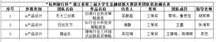 2018年12月8至9日,“杭州银行杯”浙江省第三届老员工金融创新大赛在下沙举行公司学子积极参与此次竞赛,其中,由李忠老师指导的作品《锂电行业三环链式创新投资策略》、胡军辉老师指导的作品《白酒行业投资策略报告》和张海军老师指导的作品《5C行业分析投资策略报告》均喜获三等奖。