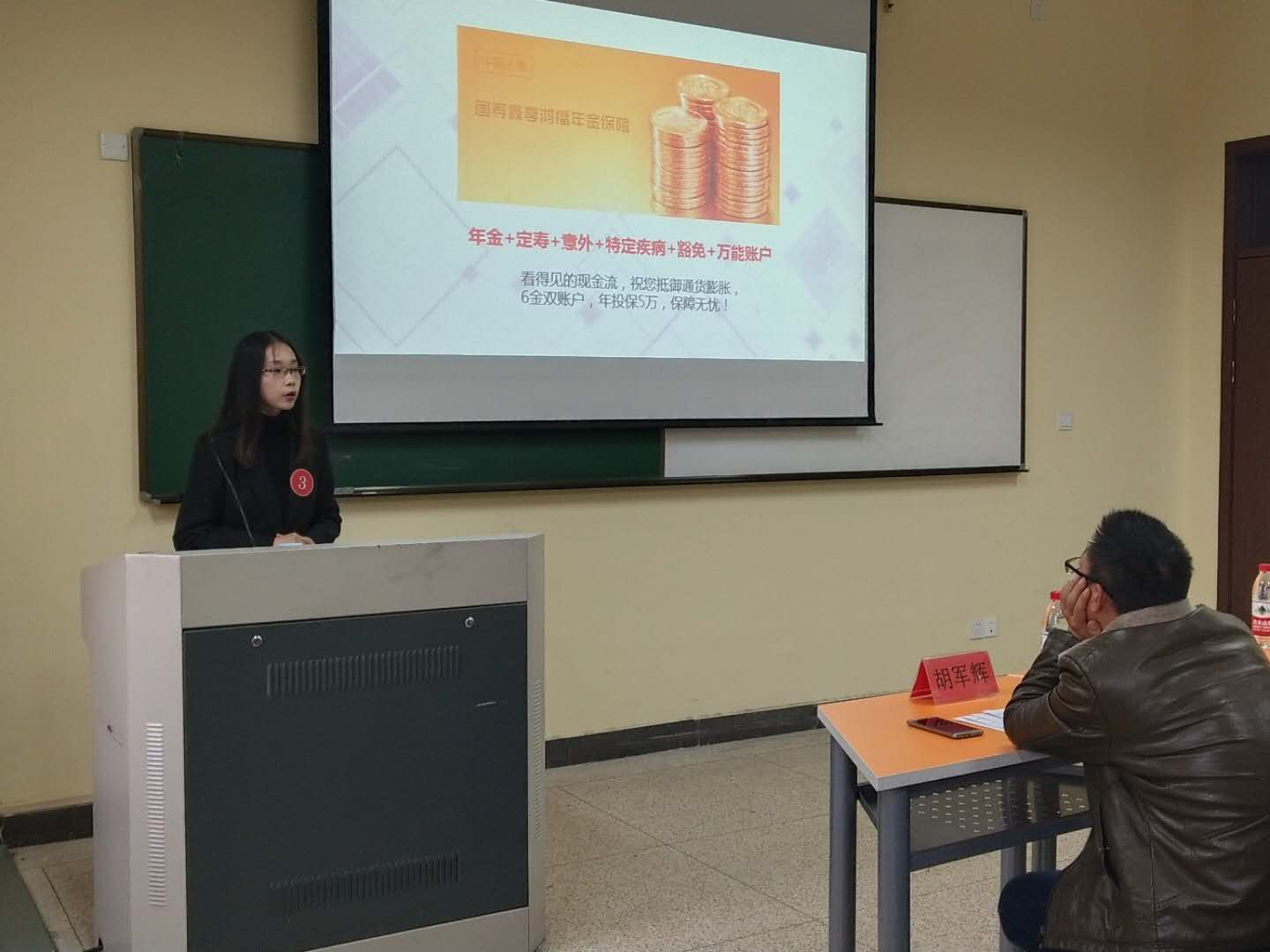 2018年12月25日下午,由3044永利集团金融与经贸分院和创业公司联合主办的第五届保险营销竞赛决赛在1教306教室顺利举行。担任本次活动的评委有金融与经贸分院副经理胡军辉老师、金融系系主任张海军老师和副系主任刘冬双老师。