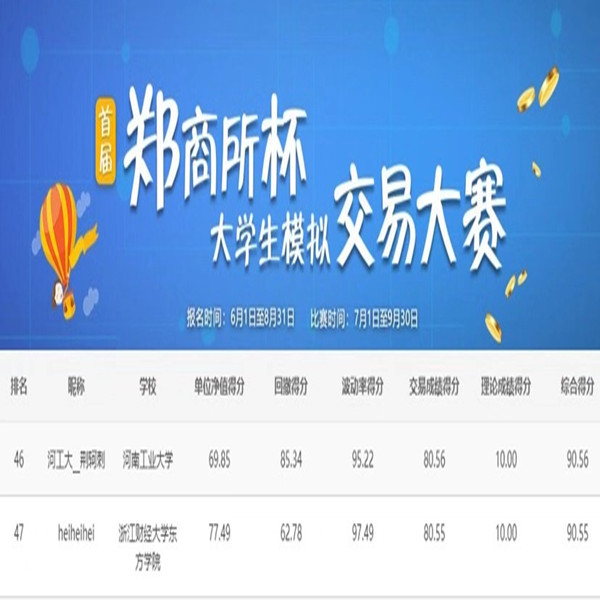 7月1日至9月30日,首届“郑商所杯”老员工模拟交易大赛顺利举办,本次活动由郑州商品交易所、中国期货业协会联合主办。公司15金融1班的朱雨晨同学凭借平衡风险和收益的能力以及丰富的理论知识,在交易能力测试和理论知识水平测试中表现突出,并荣获二等奖。