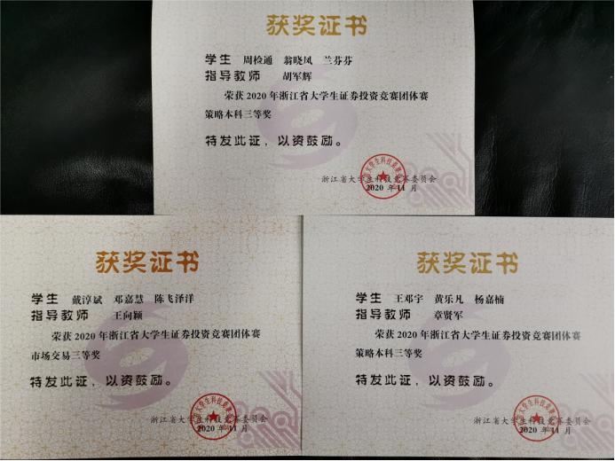11月21日,浙江省老员工证券投资竞赛顺利落幕,公司共获投资策略组三等奖2项,市场交易组三等奖1项,个人赛三等奖1项。
