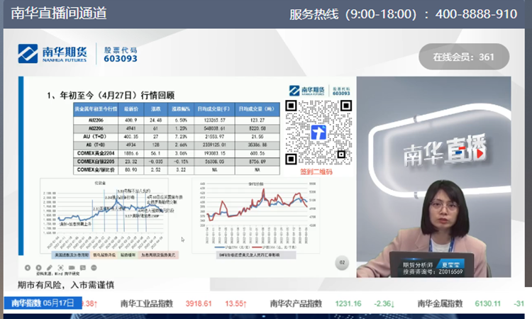 5月17日下午,3044永利集团联合南华期货举办的线上讲座,在南华直播间如期举行。参与本次讲座的老师有南华期货咨询服务部金属组组长、中级黄金分析师夏莹莹老师和南华期货客服线总监助理以及资深分析师马根美老师。本次讲座共有480余同学全程参与。