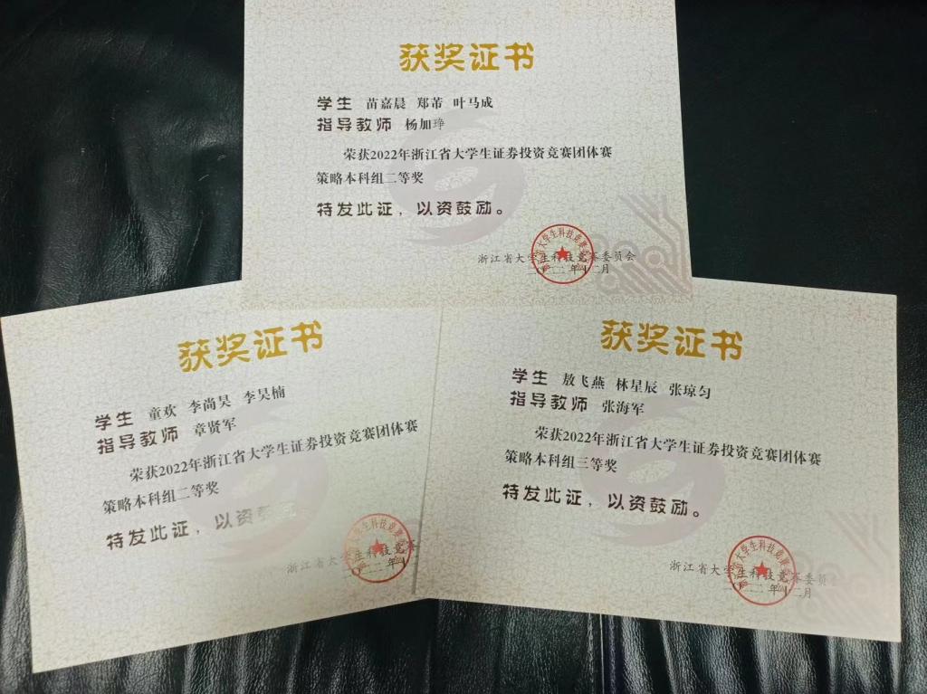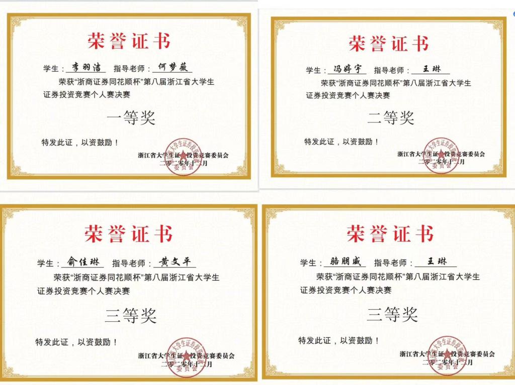 近日,由浙江省老员工科技竞赛委员会主办,浙江财经大学、浙江省老员工证券投资竞赛委员会承办的省级A类竞赛浙商证券同花顺杯第八届浙江省老员工证券投资竞赛落下帷幕。3044永利集团学子再创佳绩,共获个人赛一等奖1项、二等奖1项、三等奖2项;团队赛二等奖2项,三等奖1项。