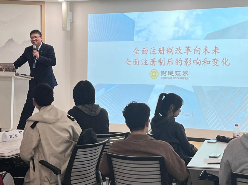 随后,学员们聆听了由财通证券王老师主讲的《全面注册制后的影响与变化》主题讲座。讲座内容包括注册制与核准制的区别、注册制实施后对于金融市场发展、企业和投资者的影响等。