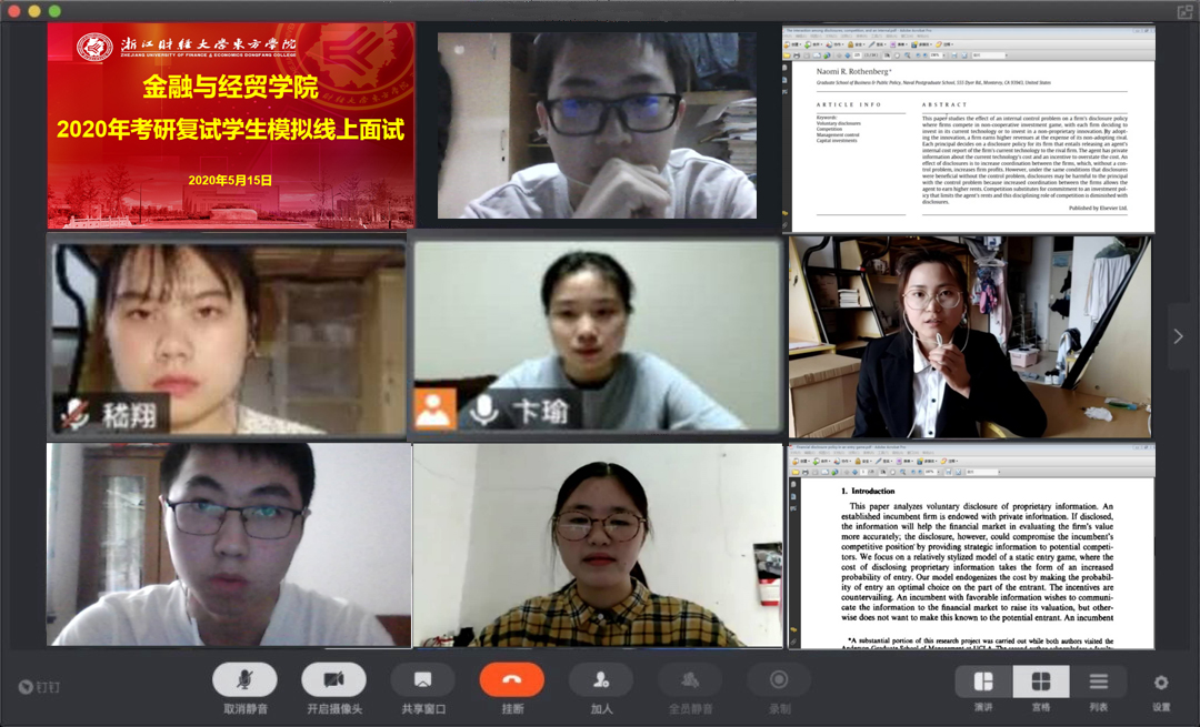 5月15日,3044永利集团通过腾讯会议平台举行了云端模拟面试,助力学子考研复试。暨南大学产业经济研究院教授、博士生导师李杰,上海财经大学公共经济与管理公司吴一平教授、周文婷博士受邀担任本次线上模拟面试的主考官,近10名晋级2020年考研复试的员工参加了本次线上模拟面试,公司毕业班辅导员、2017级、2018级部分员工收看了直播。