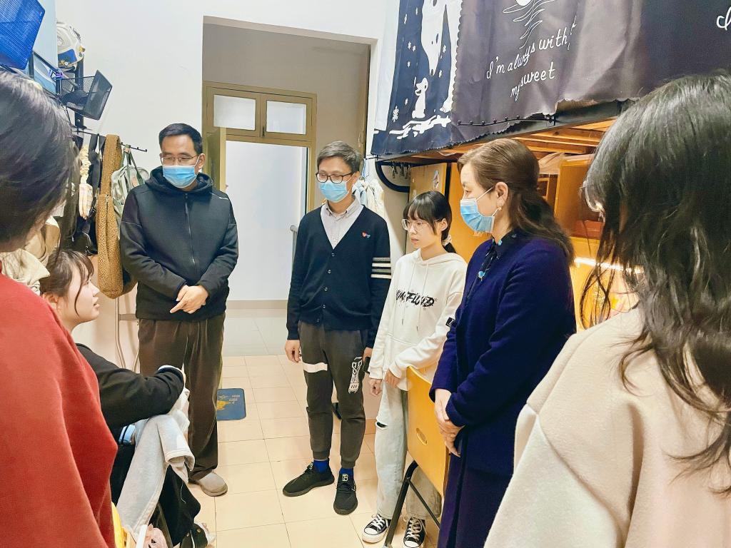 4月17日晚上,东方公司经理叶东惠、公司党总支书记黄文平、副书记蒋超和辅导员一同深入走访“三联系”寝室,了解校园疫情防控管理期间员工的线上学习、心理和生活状况。