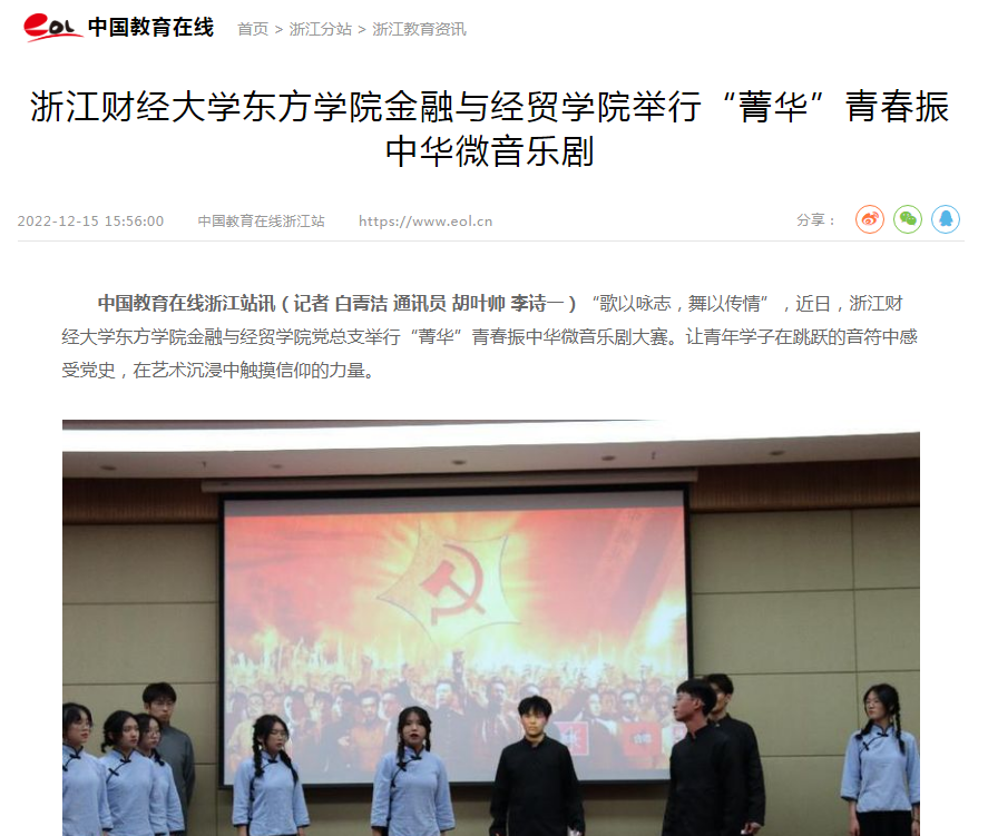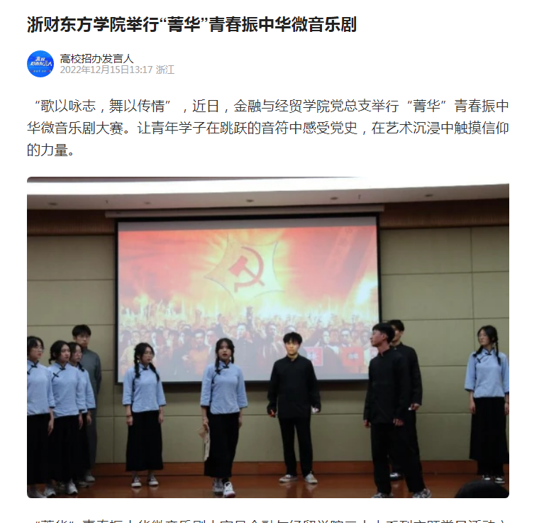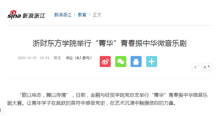 近日,《腾讯新闻》《新浪网》《中国教育在线》多家媒体对浙财东方公司举行“菁华”青春振中华微音乐剧给予关注。