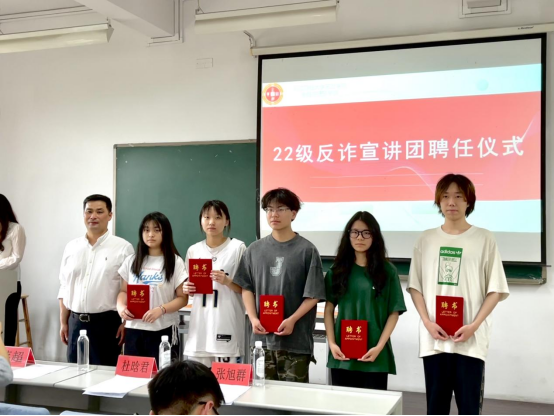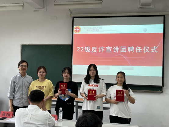 本次活动组织各班反诈宣讲团成员观看了海宁市公安局提供的反诈宣传视频,带领员工干部一起学习了电信网络诈骗的主要类型和基本诈骗套路后,请2022级各班反诈宣讲团代表上台签署了反诈骗督导书,明确反诈宣讲团职责,并邀请杜晗君部长和蒋超副书记为2022级各班反诈宣讲团代表颁发聘任书。