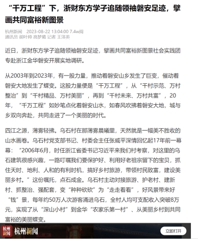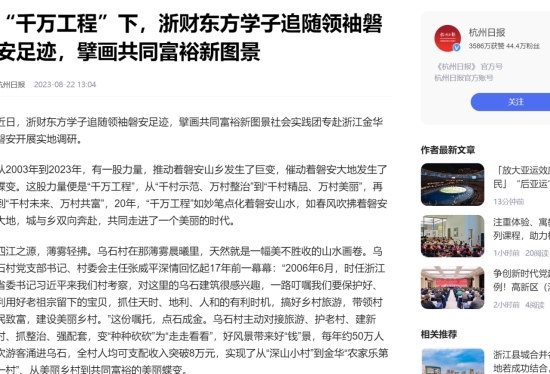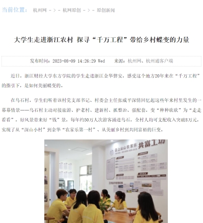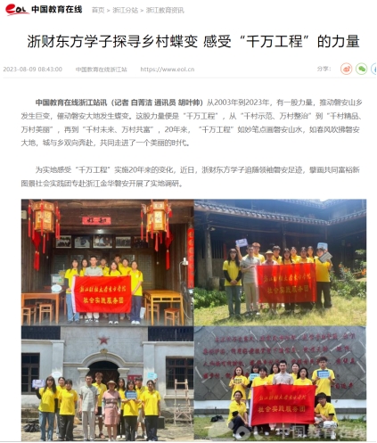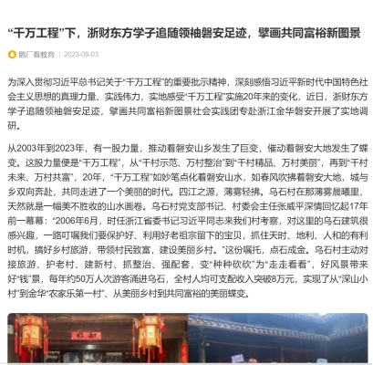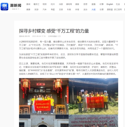 公司赴金华磐安“追随领袖磐安足迹,擘画共同富裕“新图景”社会实践服务团赴在指导老师胡叶帅的帮助与启发下,顺利开展老员工“三下乡”暑期社会实践活动。团队以学习磐安县如何根据习近平总书记的指导坚持一张蓝图绘到底为主要目标,在开展走访调研中,追随领袖足迹,擘画共同富裕新图景。青年学子跨越山水赴磐安,通过实地调研乌石村、玉山古茶场、湖上村、江南药镇养生博览馆,深刻感悟习近平新时代中国特色社会主义思想的真理力量、实践伟力,实地感受“千万工程”实施20年来的变化,实践成果受到了中国网、中国教育在线、中国青年日报、杭州新闻、杭州日报、杭州网、全网基层党建网等多家媒体关注报道。