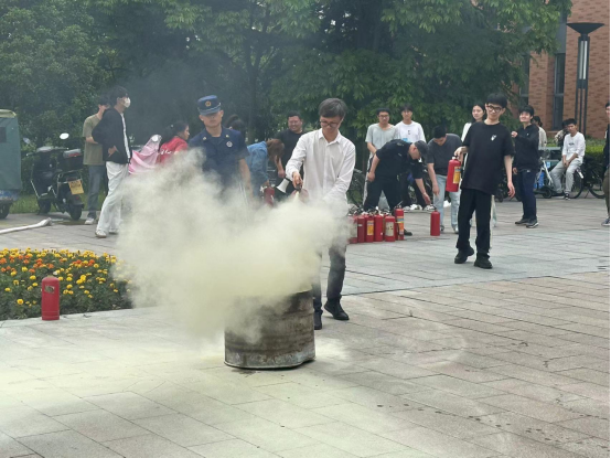该疏散演练按活动预案有条不紊地进行,参与活动的师生从图书馆中迅速撤离,用时符合要求,整个演练过程紧凑有序。疏散至图书馆前小广场后,海宁消防队指导员陆建城向师生讲解并演示了灭火器的使用方法,随后指导师生实操灭火器。