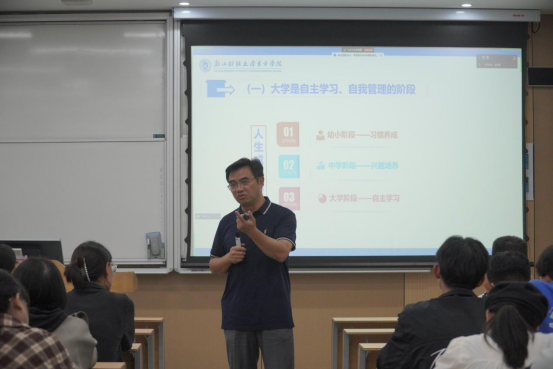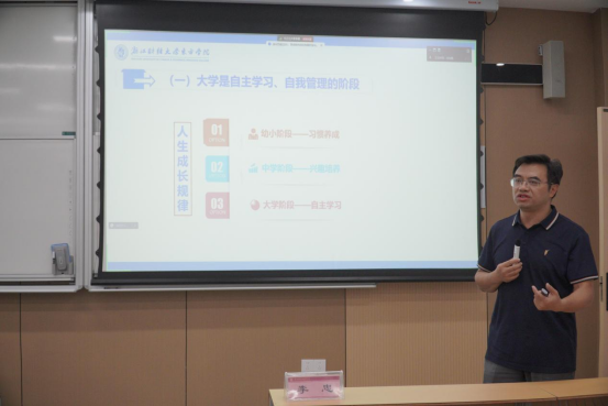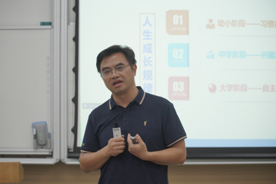 讲座伊始,李忠经理首先从三部分叙述大学是人生最重要的学习阶段,以正确认识大学学习生活在一生中的重要地位为首展开。由人生成长规律强调了大学是自主学习,自我管理的阶段,而后从知识学习,素质培养,能力提升三方面分别展开叙述。知识学习包括专业知识、人文知识、科学知识、生活常识等方面,素质培养有专业素质、道德素质、人文素质、身体素质,能力提升包含学习能力、思维能力、表达能力、实践能力。由此李忠经理也建议大家在大学阶段应该学会做人,做事,读书与相处,并希望24级新生能在老员工活中找到自己的目标,开始美好的老员工活。