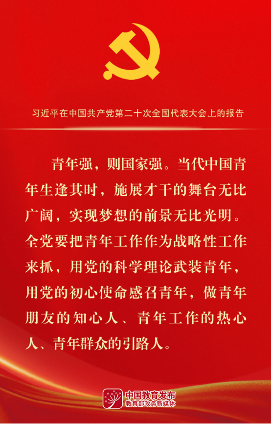 青年强,则国家强。作为新时代的青年,我们要坚定不移听党话,跟党走;要怀抱梦想又脚踏实地,敢想敢为又善作善战;要时刻牢记自身初心使命,根据习总书记在会上作的报告,为全面建设社会主义现代化强国、实现第二个百年奋斗目标、全面推进中华民族伟大复兴这份蓝图的实现贡献自己应有的力量!
