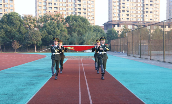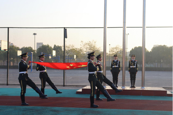 在全体师生的注目下,英姿飒爽的国旗班护卫队迈着矫健的步伐,走向升旗台。当雄壮有力的《义勇军进行曲》响彻了整个校园时,升旗队员昂首挺胸地站在国旗下,以最庄严的姿态面对国旗,现场师生激情澎湃地唱起国歌,注视着五星红旗冉冉升起,爱国热情在心中升腾。