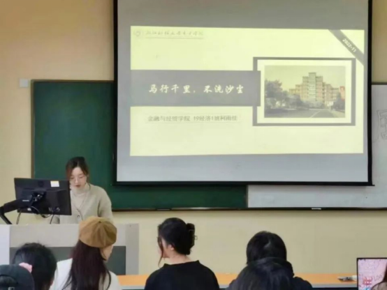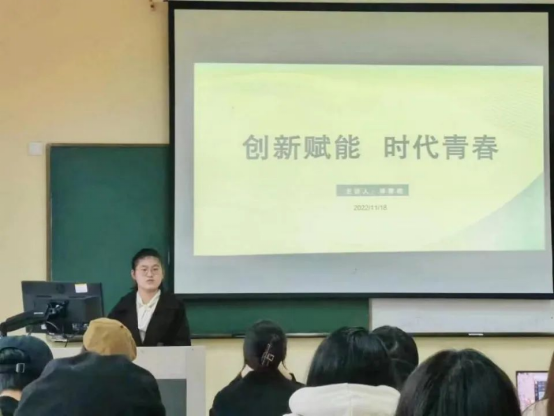 20国贸2班林蒙艳分享的主题是“创新赋能,时代青春”。她从“创新时代”、“创新思维”、“创新能力”、“创新实践”四个方面讲述了自己的学习经验和奋斗历程。她用“新角度、新思维”鼓励同学们要跳出固有思维模式,打开思维,开拓视野,成就更美好的人生。