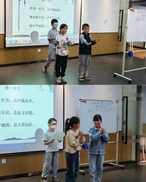 为营造儿童学习诗歌的浓厚氛围,开拓儿童学习诗词的眼界,激发儿童学习古诗的兴趣,志愿者们进行了⟪子夜吴歌•秋歌⟫古诗教学。志愿者们通过一段动画视频吸引小朋友去了解诗歌、学习诗歌。“长安一片月,万户捣衣声”小朋友们的朗朗读书声,声声入心,志愿者讲解了其中蕴含的家家户户对边境士兵的思念和对和平安定生活的向往。