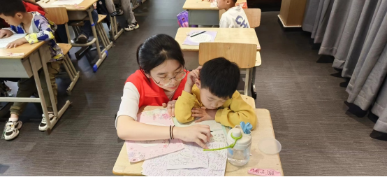 志愿者们为小朋友们准备了书法教学课。“作字先做人,心正则笔正”志愿者向小朋友们强调了练习书法的重要性,接着从握笔姿势、一撇一捺的笔画粗细中教学,小朋友们纷纷在练习纸上留下自己的作品。