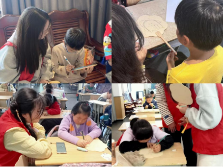 在初步掌握了团扇制作的要领之后,孩子们迫不及待地投身于自己的艺术创作之中。他们小心翼翼地挑选色彩,细心地构图,每一笔每一划都充满了对美的探索与追求。志愿者们则在一旁耐心地提供帮助与指导,他们的鼓励和细心解答让孩子们的创作之路更加顺畅。
