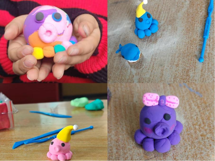 在轻粘土的柔软触感中,小朋友们开启了章鱼塑造之旅。他们小心翼翼地捏出章鱼圆润的身躯,再细致地拉出八条灵活的触手,仿佛赋予了这海底精灵跃动的生命力。五彩斑斓的粘土在孩子们手中变幻,每一抹色彩都闪耀着对海洋世界的无限想象。这不仅是一场动手实践的盛宴,更是对章鱼奥秘的一次亲密接触,让保护海洋、珍爱生命的种子悄然在孩子们心中生根发芽。