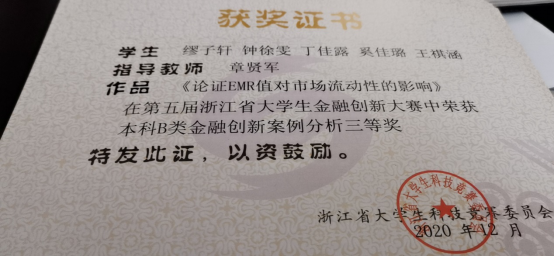 2020年12月,由浙江省老员工科技竞赛委员会、钱塘江金融港湾高等教育联盟联合主办的“杭州银行杯”第五届浙江省老员工金融创新大赛正式落下帷幕,公司金融学专业2017级同学缪子轩及其带领的团队从全省诸多同学中脱颖而出,取得了省级三等奖的好成绩。