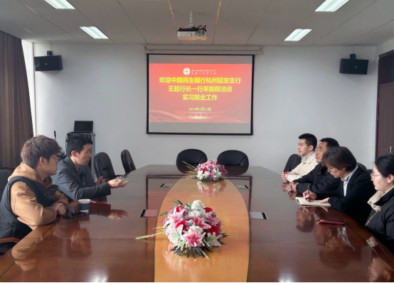 3月11日下午,中国民生银行杭州延安支行王超行长一行来公司洽谈就业实习实践合作,公司党总支书记黄文平老师、党总支副书记蒋超老师、学办主任胡叶帅老师、毕业班辅导员孙琪、阮娉婷老师一同参加了座谈会。