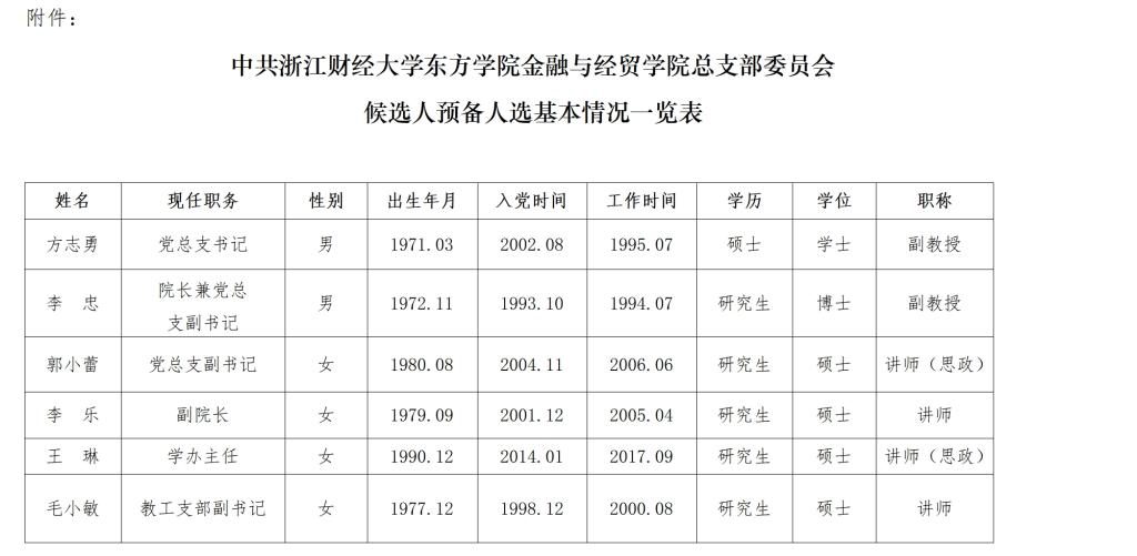 根据《关于同意召开中国共产党3044永利集团总支部党员大会的批复》(浙财大东党〔2025〕13号),在党员推荐和党支部组织推荐的基础上,经党总支研究决定,以下同志为党总支委员、书记、副书记候选人预备人选,现予以公示。名单如下: