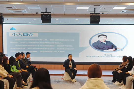 11月19日,金融经贸大讲堂暨“风采员工”励志分享会在行政楼B301举行。杭州锐策娱乐有限公司创始人2008届保险学专业员工于如茂担任本次活动主讲嘉宾。